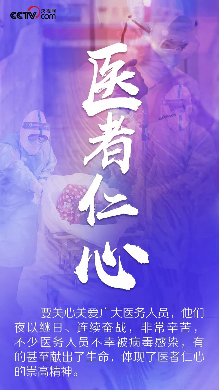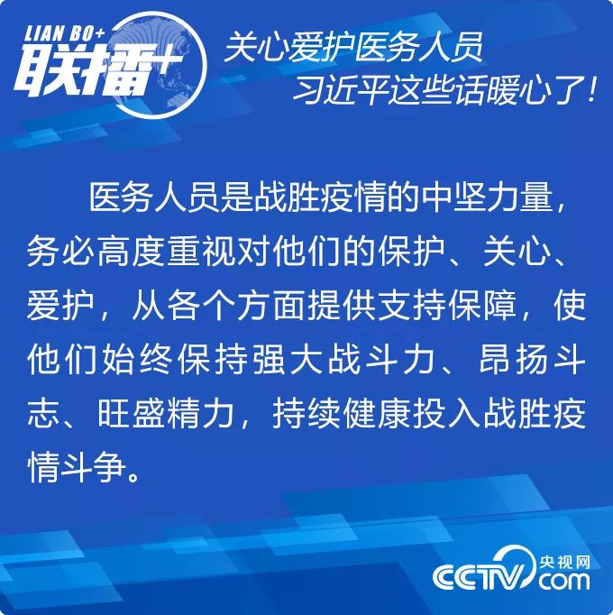 新冠肺炎疫情发生以来,广大医务人员舍小家顾大家,夜以继日投身战“疫”。习近平多次主持召开会议、发表重要讲话、作出重要指示,高度肯定医务人员奉献精神,强调要关心爱护医务人员,情真意切,言之谆谆。央视网《联播+》特梳理,为全国特别是湖北和武汉奋战在疫情防控一线的医务人员带去党中央的关怀。